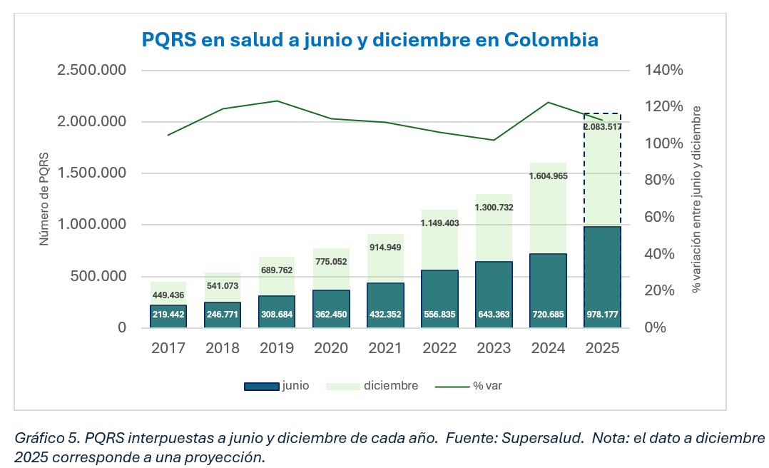 En los últimos años, se ha evidenciado un crecimiento sostenido en el número de quejas relacionadas con el sistema. Según datos de la Superintendencia de Salud, entre enero y junio de 2025 se han registrado 978.177 quejas, peticiones y reclamos, lo que representa un incremento del 36% en comparación con el mismo periodo de 2024 (ver gráfico 5). Esto equivale a una tasa de 202 PQRS por cada 10.000 afiliados al sistema de salud, siendo el macromotivo más frecuente las barreras de acceso a tecnologías y servicios de salud, que concentran el 93,01% de los casos.