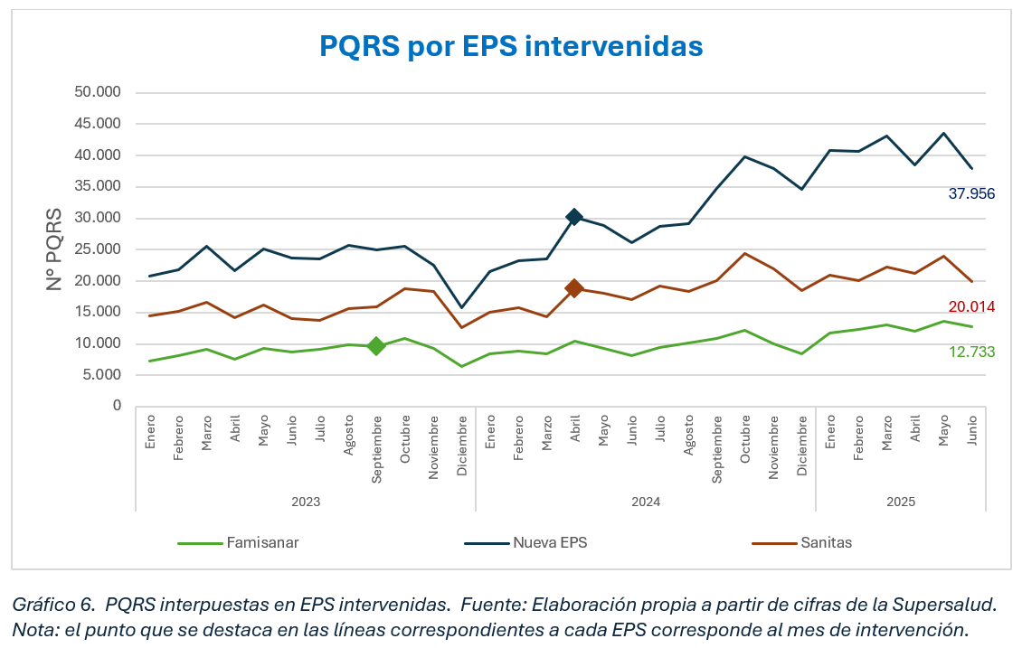 Como se observa en la gráfica 6, las 3 EPS intervenidas con mayor número de afiliados evidencian un incremento importante posterior a la intervención, Famisanar ha aumentado las PQRS en un 41% a partir del 15 de septiembre de 2023, Nueva EPS el 44% después del 03 de abril de 2024 y Sanitas el 27% después del 02 de abril de 2024.